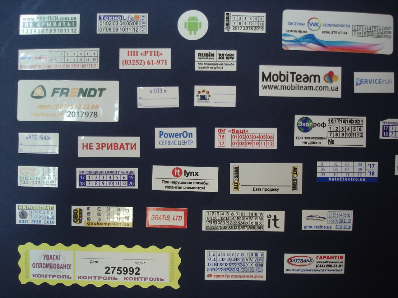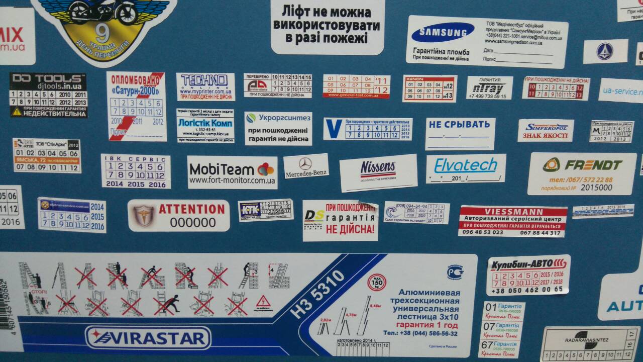 Ми є виробниками гарантійних захисних наклейок, що саморуйнуються. У нас власне виробництво, тому ми завжди зможемо запропонувати Вам мінімальні терміни та доступні ціни на гарантійні наклейки (стікери).