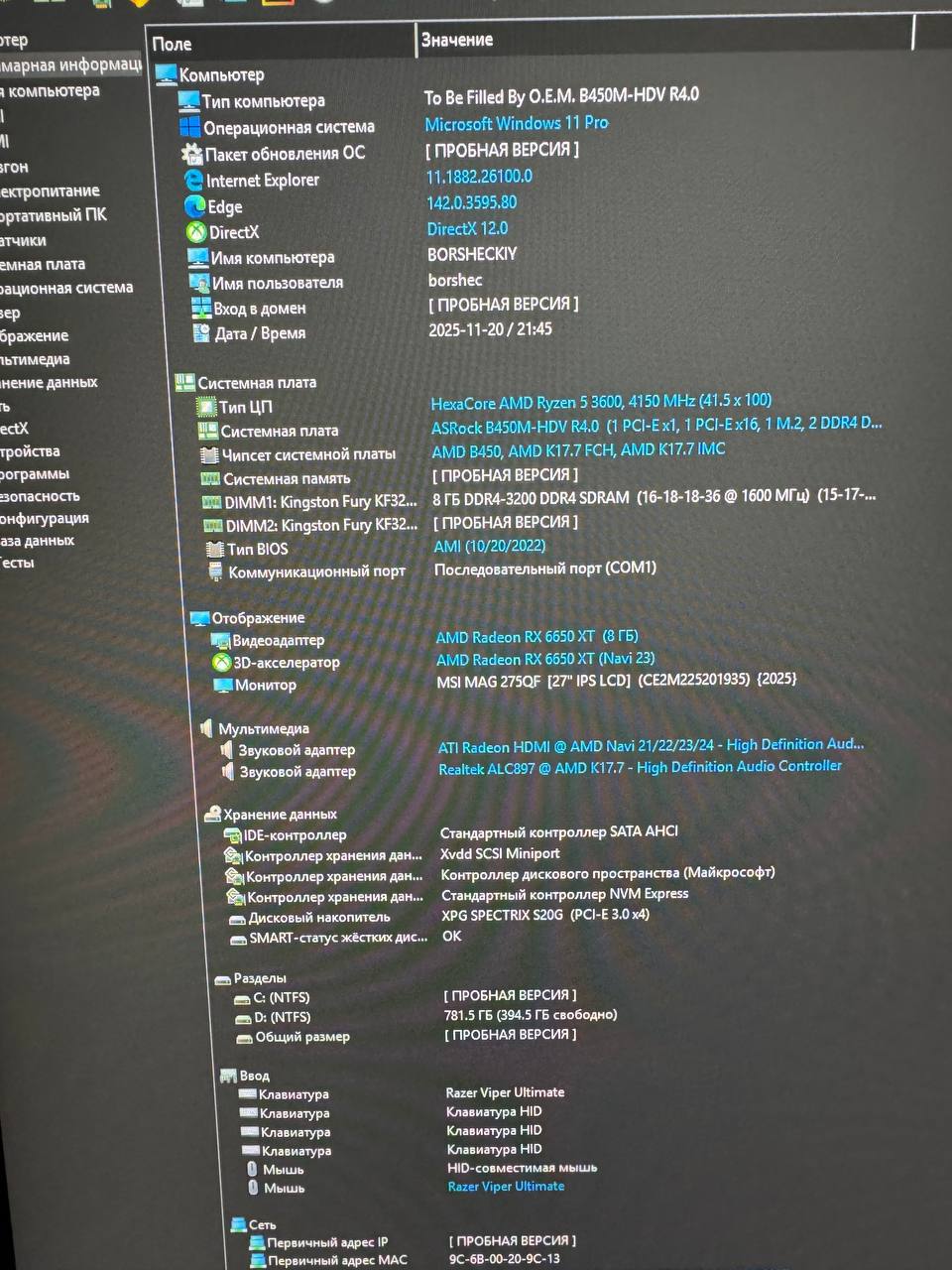 • ОЗП: Kingston Fury DDR4 2x8GB 3200MHz