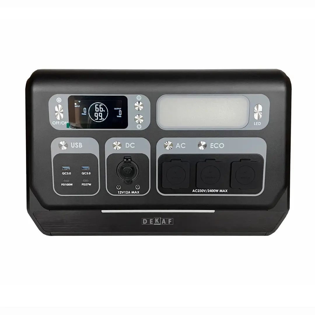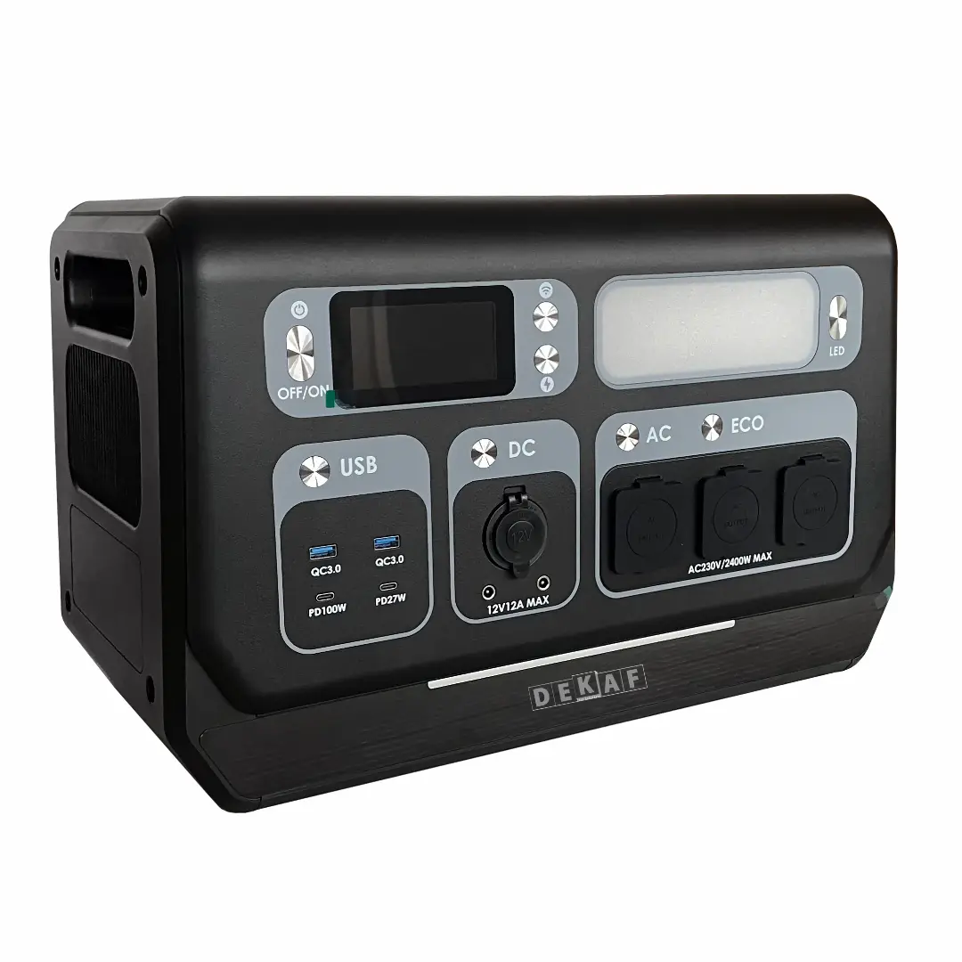 Dekaf 2400 Вт — портативна зарядна станція потужністю 2400 Вт із літій-залізо-фосфатним акумулятором. Ідеально підходить для резервного живлення будинку, подорожей і активного відпочинку. Надійна, багатофункціональна, із системою захисту